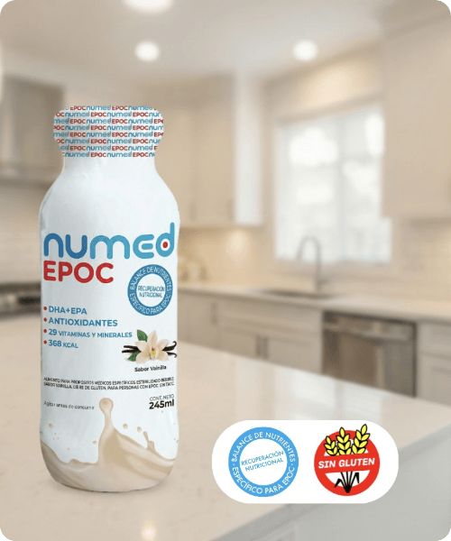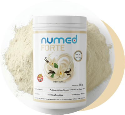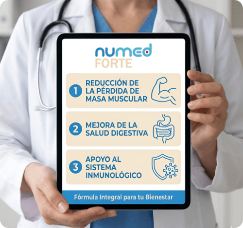 Numed Forte cuenta con aporte de HMB-Ca, metabolito de leucina, un aminoácido esencial, que ha sido asociado con la reducción de la pérdida de masa muscular, la mejora en la recuperación muscular y el aumento de la síntesis de proteínas musculares. Su incorporación como alimento favorece la conservación y recuperación de la masa magra, especialmente en poblaciones de adultos mayores o pacientes con condiciones que conducen a la sarcopenia.