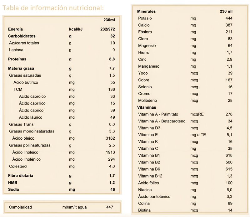 - Densidad calórica de 1 kcal/ml (232 kcal/230ml).